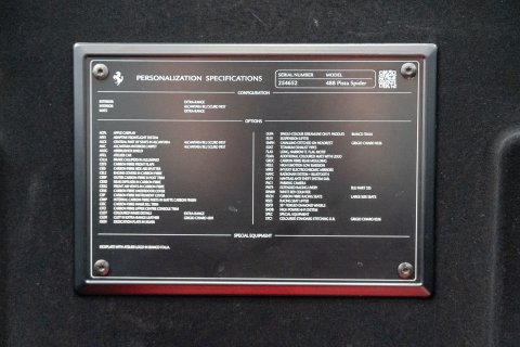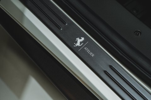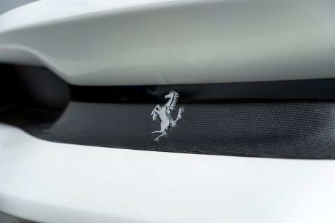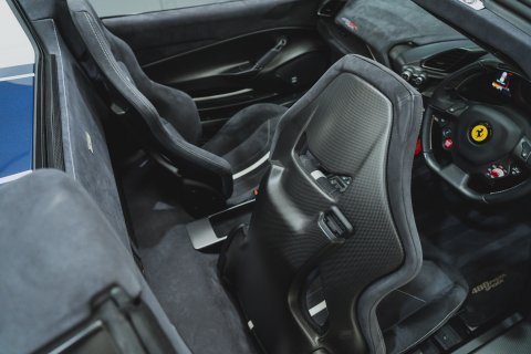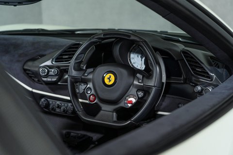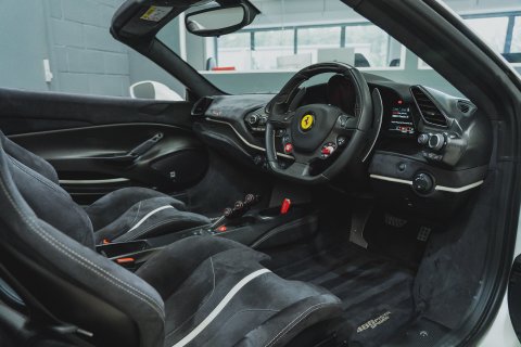 Bearing that Prancing Horse emblem it is of course an exceptionally beautiful car with both sharp yet, elegant lines aplenty, that will catch your eye wherever it goes. In spider form, it brings the notion of performance, design and outright thrills to a whole new level and its easy to see why these cars are so sought after.We have now had the privilege to deal with a number of 488 Pistas and this particular one is a stunning example. This 2020 (20) Ferrari 488 Pista Spider comes equipped with an enormous list of optional extras and an astonishing amount of Carbon Fibre components. It also benefits from a Ferrari warranty running until June 2024 and a Ferrari Service Pack that runs until June 2027. The car has covered just 3,300 miles and has a full coating of Paint Protection Film too.From the moment you give this car your attention you can feel the sense of power it possesses in all manner of the phrase. Its colour combination is beautiful and when paired to the heaps of Matte Carbon Fibre, it makes it so special indeed. It also bears Atelier Car status. The paintwork is the beautiful Bianco Italia, which is met in the middle of the car by a Blu NART Stripe that runs the full length of the car. You’ll find Carbon Fibre at almost every conceivable exterior component; Front Splitter, Front Flaps, Side Skirts, Side Air Splitters, Rear Diffuser and the Rear Mouldings. There are also the optional Painted Scuderia Shields on the front wings which are simply stunning.