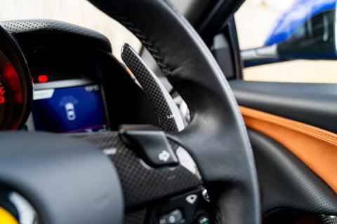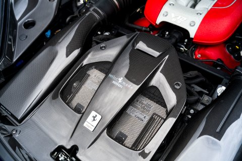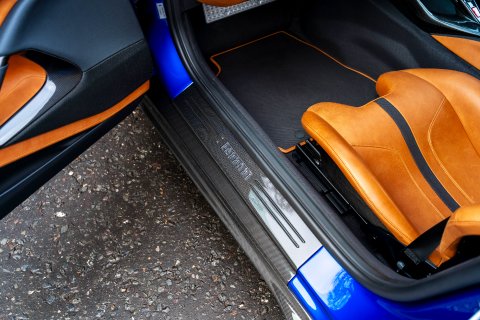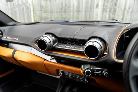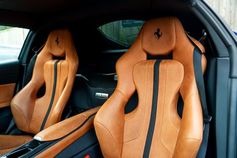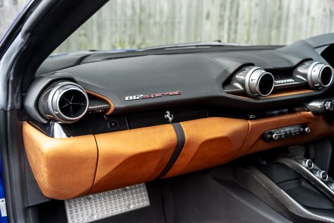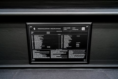 The Tailor Made specification begins the moment you first look at this car. Finished in the beautiful Blu Elettrico paint, which dresses the 812 body brilliantly. Contrasting this is a Shaded Tricolour Livery on the Front Bumper, Lower Part of Front Wings and Rear Lid. Around every area of the exterior is Glossy Carbon Fibre - you'll find it on the Front Splitters, the Front Bumper Mouth, Side Skirts, Rear Diffuser, Rear Boot Trim and Rear Side Bumpers. There's 20" Forged Dark Painted Wheels and Airbrushed Scuderia Shields on the Front Wings. It's a scintillatingly brilliant aesthetic for this phenomenal car.