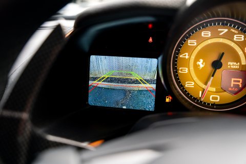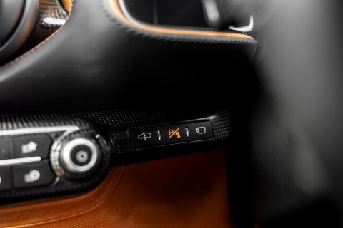 Inside, the specification continues further. The Large Carbon Fibre Racing Seats are finished in a beautiful Count Prestige Reddish Brown Leather. Which features an Embroidered Black Cavallino on each of the headrests, Cuoio 277 Tone-on-Tone Stiching and a Black Trefoil Design Superfabric Central Stripe. This palette continues across the cabin with a Black Leather Dashboard, a Count Prestige Reddish Brown Leather Lower Dashboard with a Black Trefoil Design Superfabric Stripe . In addition to this, the car also comes with a full luggage set to match the interior, plus a suit bag too! Furthermore, there is the all-important Passenger Display. Echoing the exterior, Glossy Carbon Fibre is present on almost every conceivable component able to wear it! Other key highlights worth mentioning on this car include Front and Rear Parking Cameras, Suspension Lifter, Tailor Made Dedication Plate in Silver with Tri-colour Livery and rear Privacy Glass.