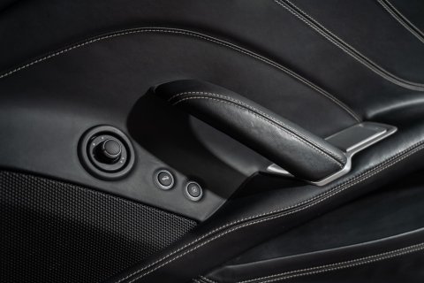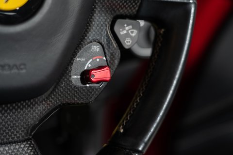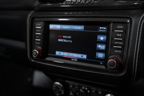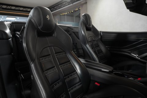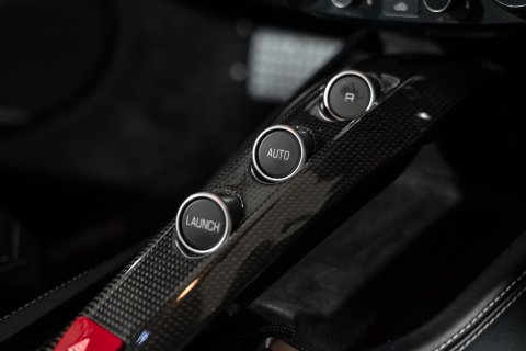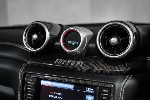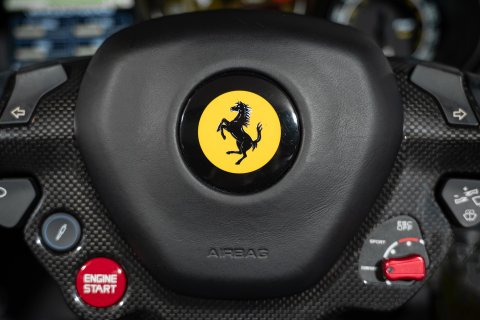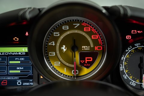 The interior is finished in Nero Leather with contrasting stitching and embroidered Prancing Horses on the Headrests in Grigio Chiaro. This stunning interior also benefits from the optional Carbon Fibre Driving Zone + LEDs. There's also the Central Bridge, Door Sills and Dash Inserts all in Carbon Fibre too. In addition, it has the optional Rev Counter in Yellow and Foot Pedals and Rest in Aluminium.