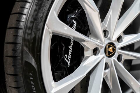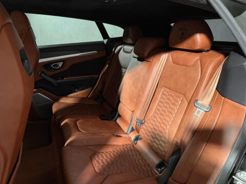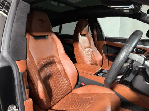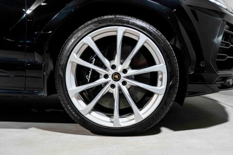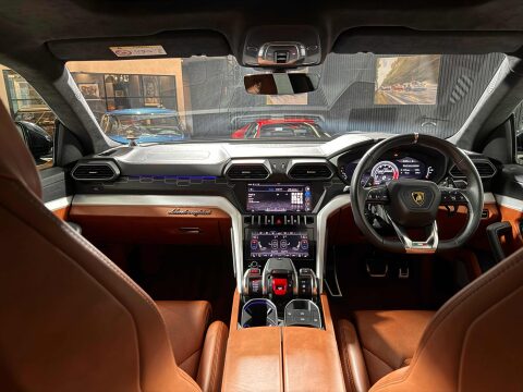 Finished in the sophisticated Nero Helene paint, this Urus projects an aura of understated power and elegance. The imposing presence is enhanced by the 23" Taigete Glossy Silver Rims that perfectly complement the exterior finish. The Black Brake Callipers with White Lamborghini Script provide a subtle yet distinctive contrast against the wheels.