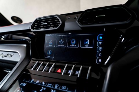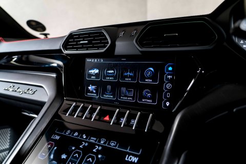 The exterior design screams Lamborghini DNA with sharp, angular lines, an aggressive front fascia featuring the iconic Y-shaped LED headlights, and a distinctive rear spoiler. Inside, the cabin blends luxury with sportiness, featuring premium leather upholstery and Lamborghini's signature hexagonal design elements throughout. The driver-focused cockpit includes multiple drive modes accessible through the ANIMAA selector, allowing you to transform the vehicle's character from comfortable cruiser to track-ready monster.